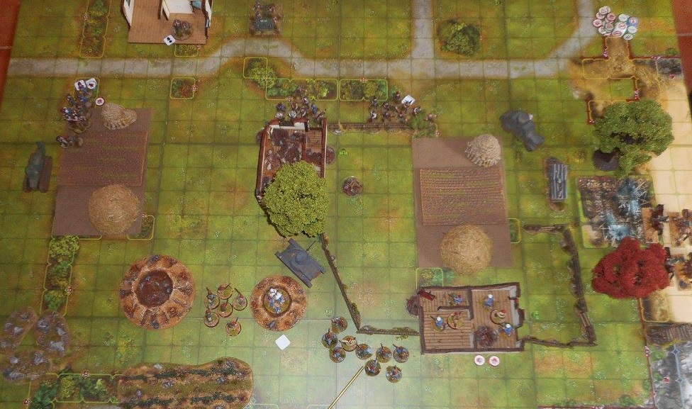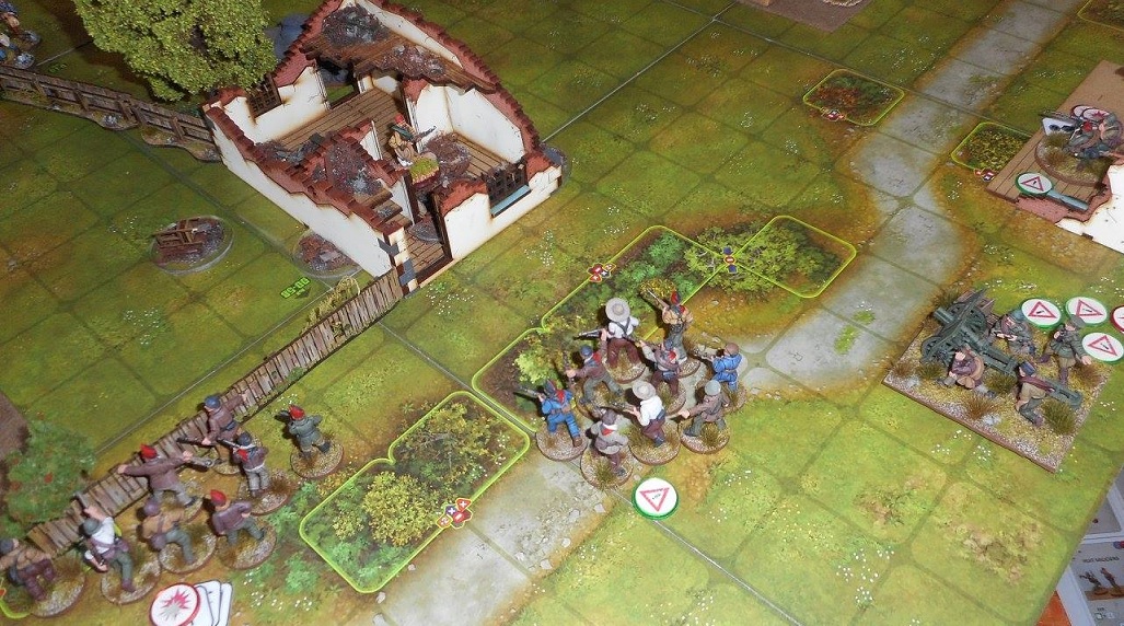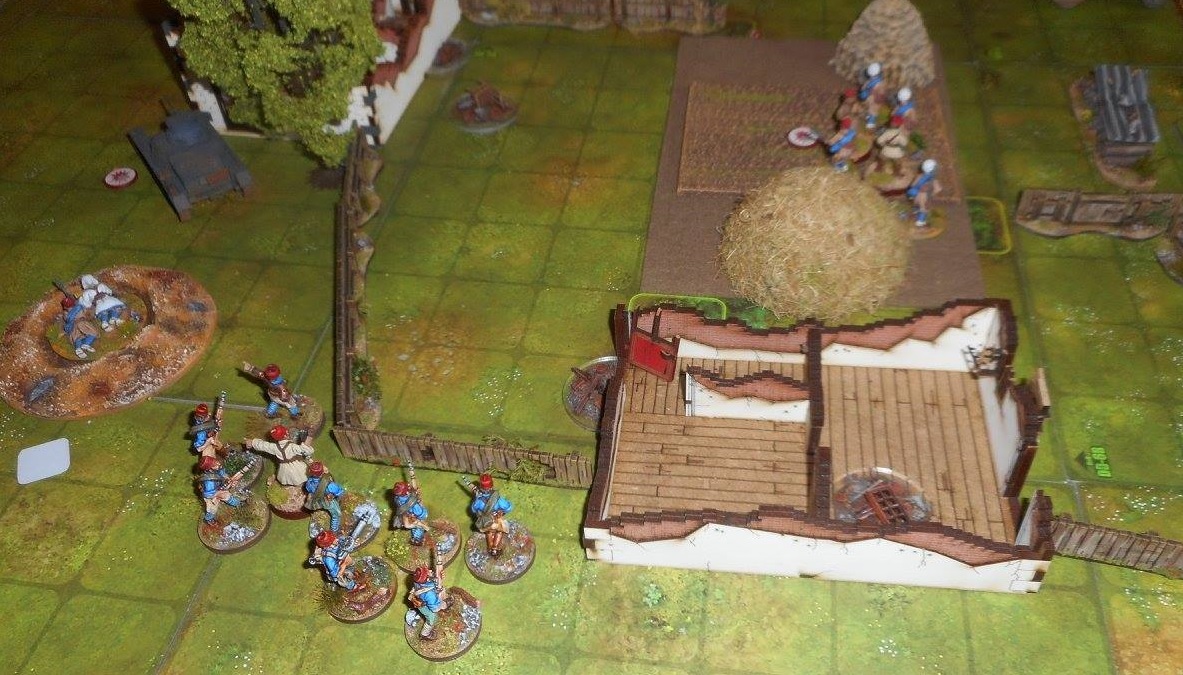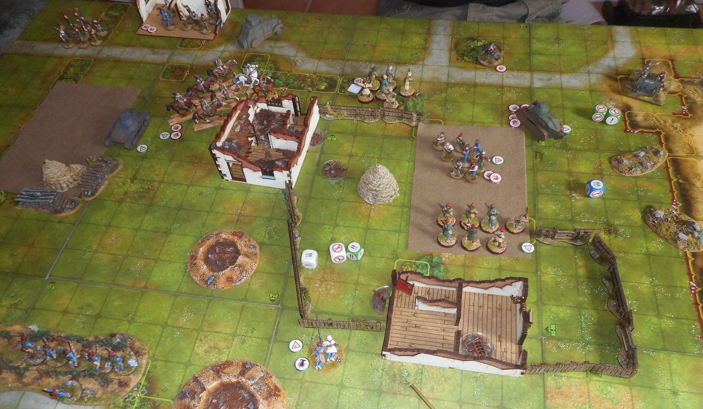 | Vue aérienne du champ de bataille. Les Nationalistes se ruent au centre du dispositif avec une fois encore le redoutable Panzer I en première ligne. Mais cette fois, mon canon est idéalement placé, appuyé par la Hotchkiss embusquée dans l'une des maisons en ruines. |